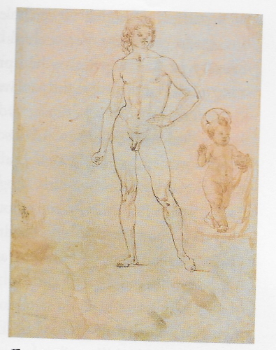 | Student drawing of Leonardo maybe posing for Verrocchio's David? Definetly a different pose here. |